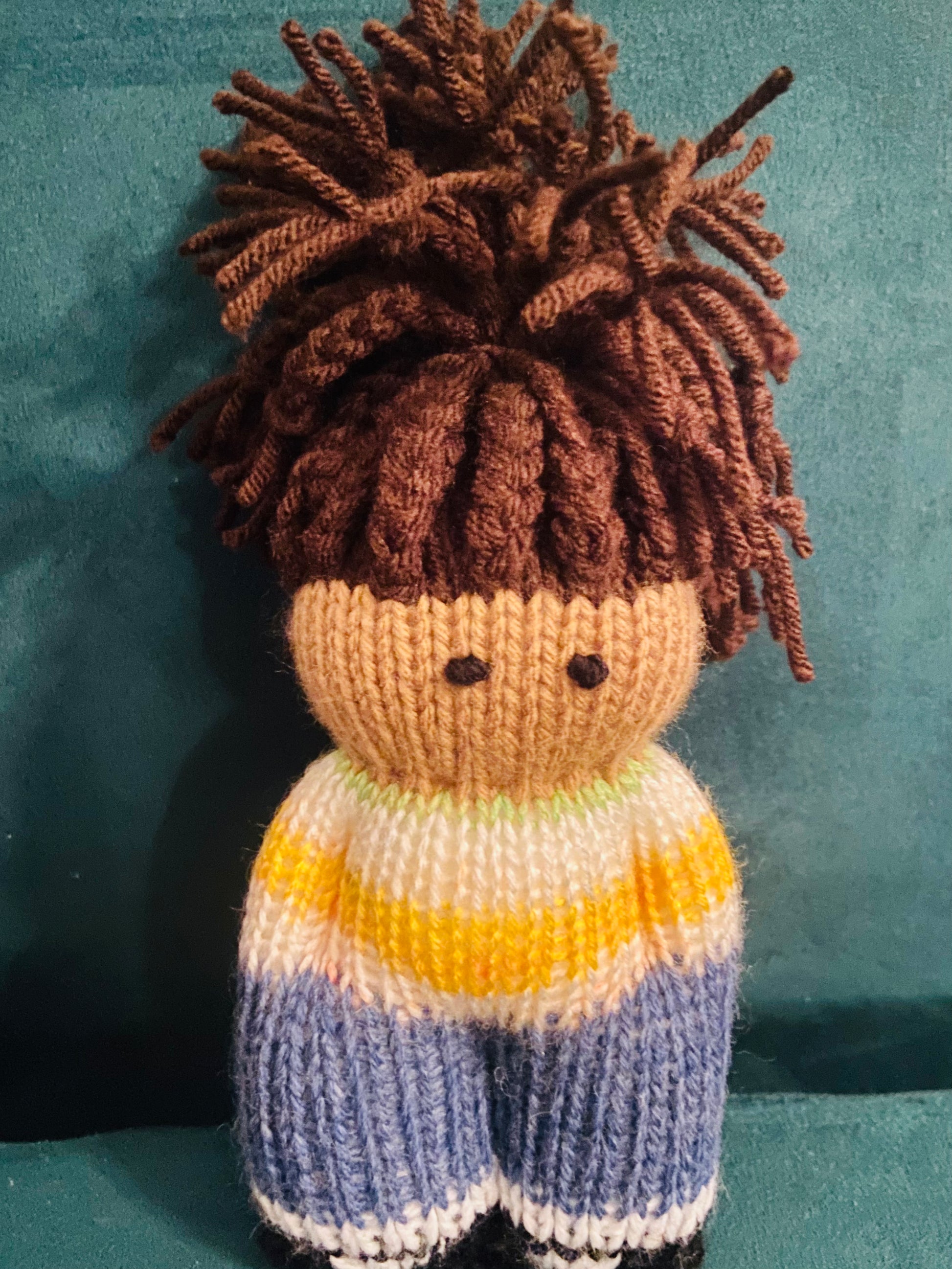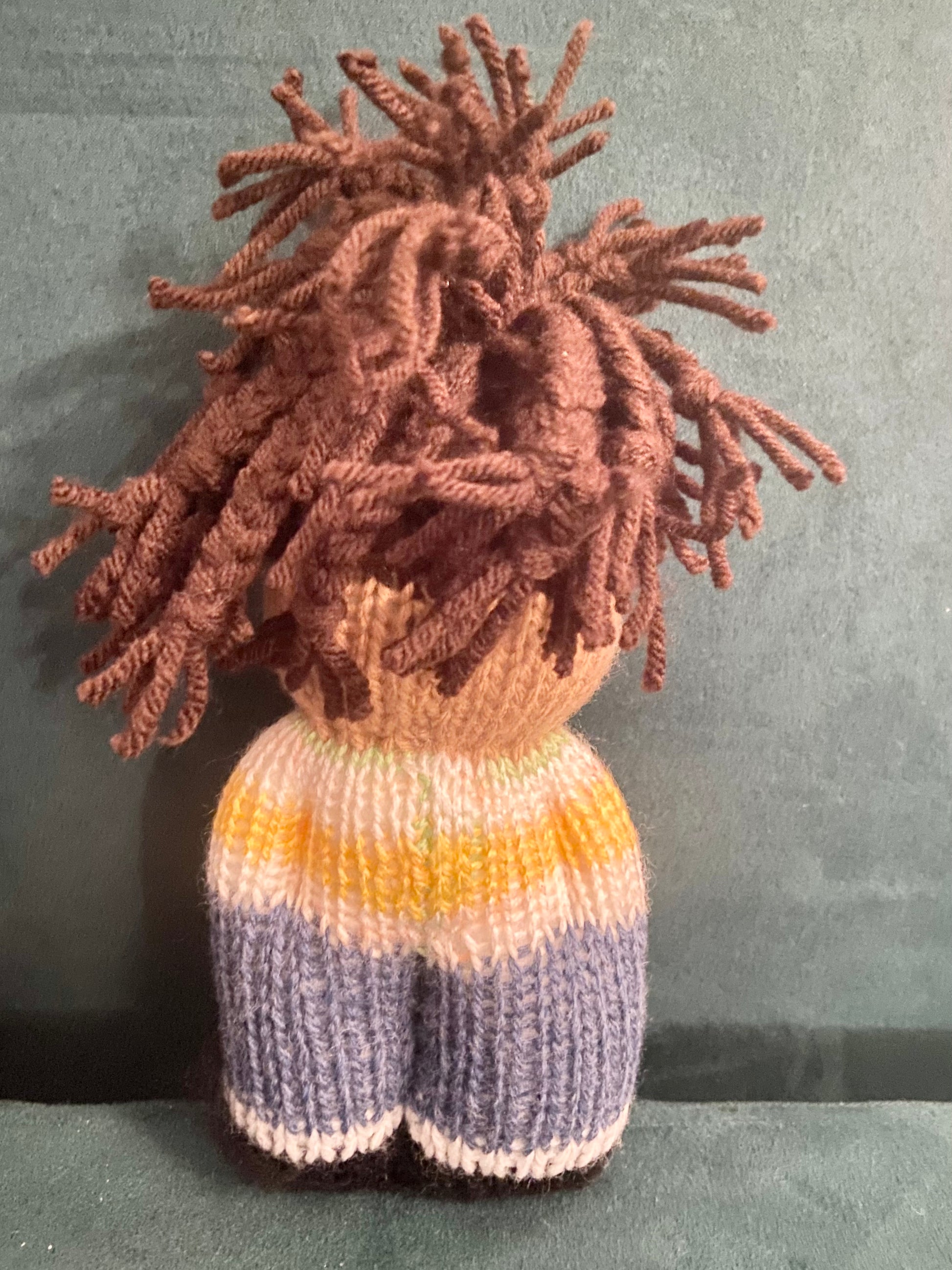 Black knit doll with Locs in top knit with yellow & white sweater + blue pants and shoes